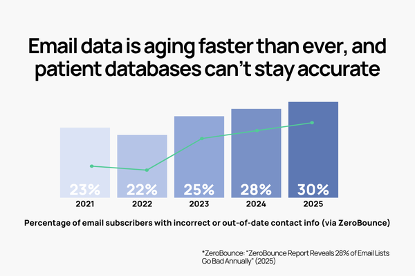 Invalid addresses remain the biggest driver of decay, with catch-all emails and inactive accounts close behind. For patient recruitment, this reality translates to missed outreach, wasted media spend, and growing inefficiency in campaigns that rely on outdated or incomplete contact lists.
