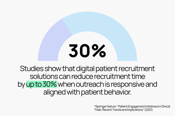 The window of opportunity to engage a patient for trial participation opens and closes faster than ever. Studies show that digital patient recruitment solutions can reduce recruitment time by up to 30% when outreach is responsive and aligned with patient behavior.