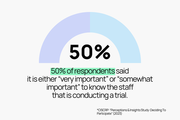 And the data backs this up: CISCRP found in a recent study that 50% of respondents said it is either “very important” or “somewhat important” to know the staff conducting a clinical trial. That’s half of all potential participants placing value not just on the science, but on the people behind it.
