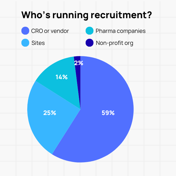 Our analysis of 100 live patient recruitment ads showed that CROs and vendors run 59% of all patient recruitment ads, while sites account for 25%, pharma companies 14%, and non-profits only 2%.